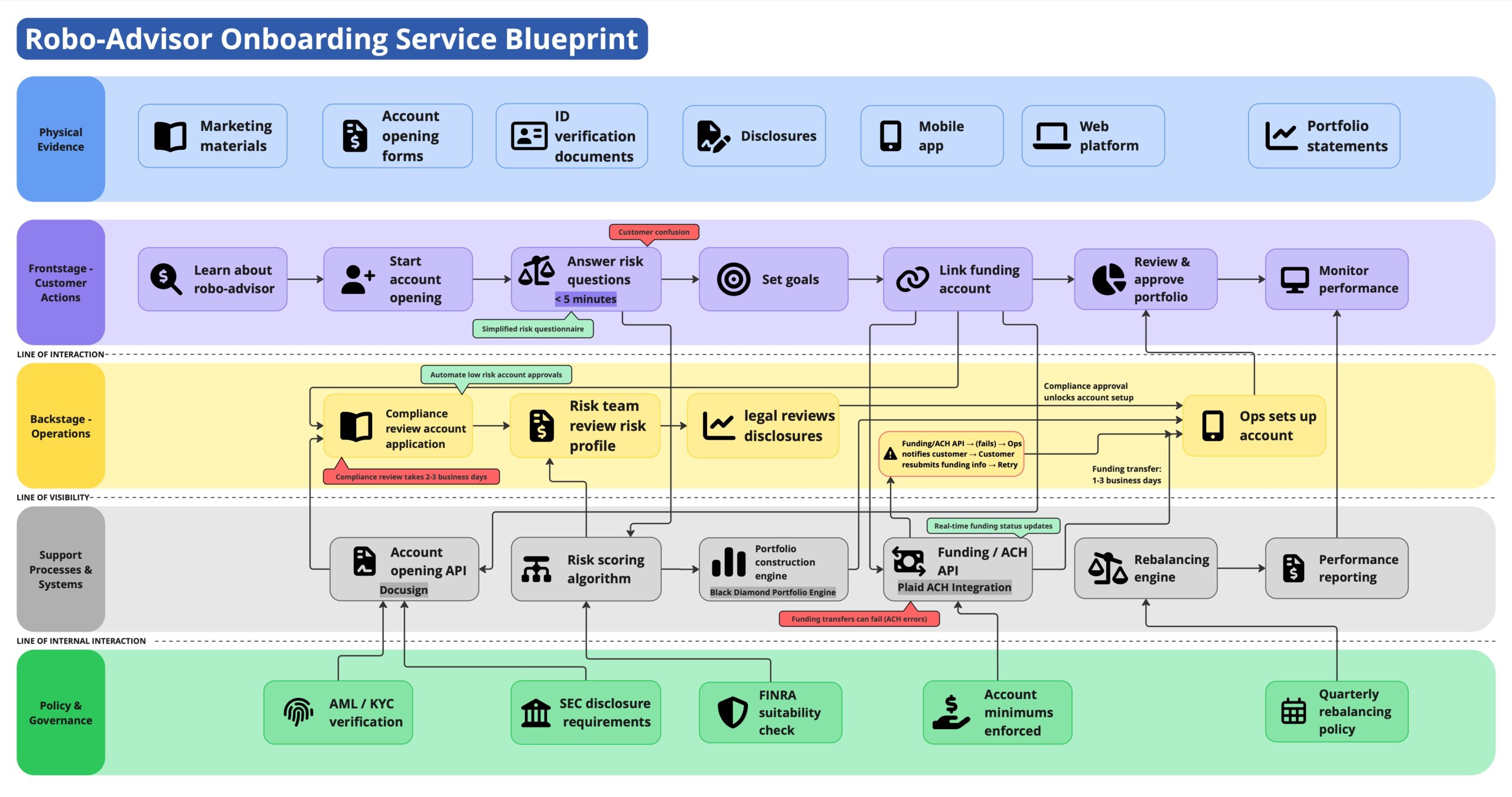 - Scope: End-to-end service design: Onboarding, goal-setting, portfolio tracking, systems integration, compliance gates, operations workflows